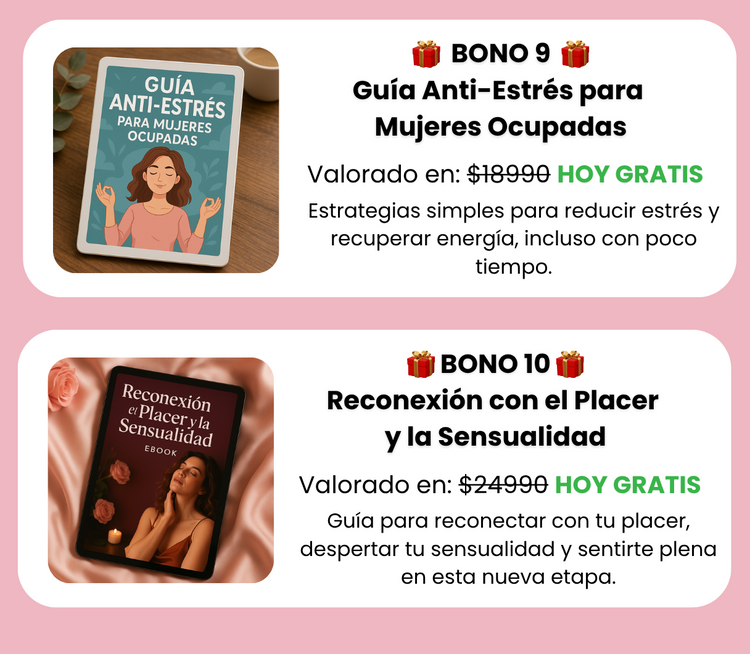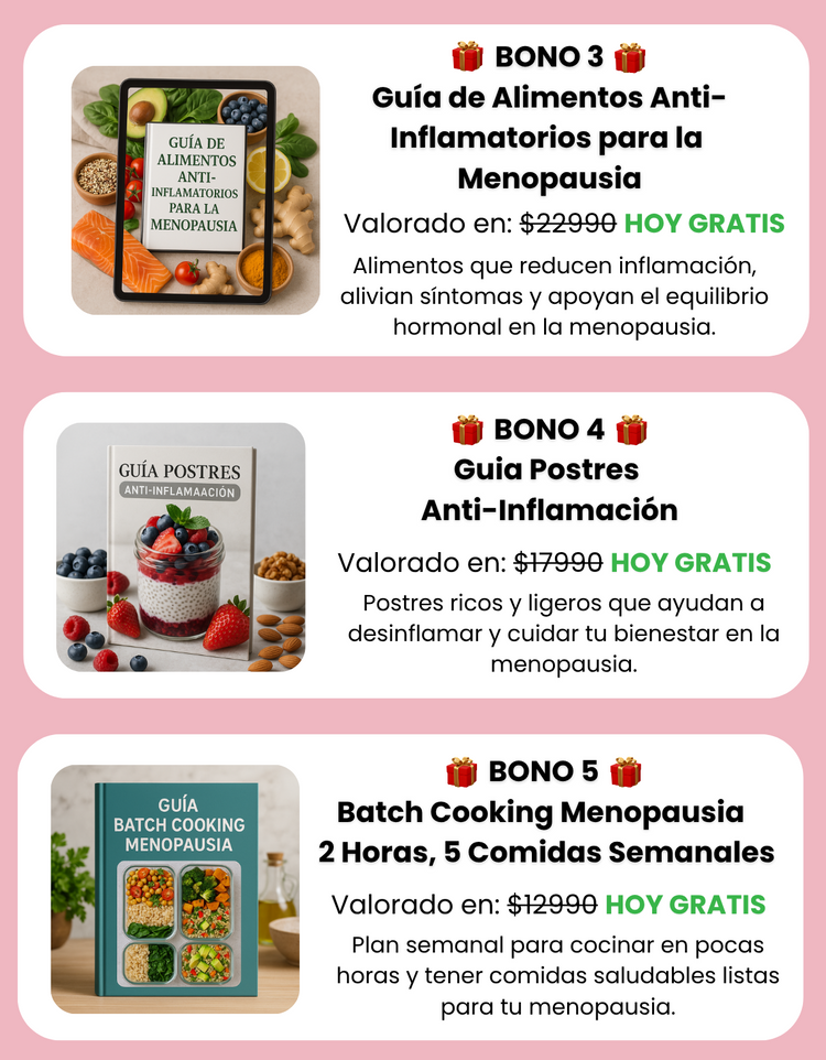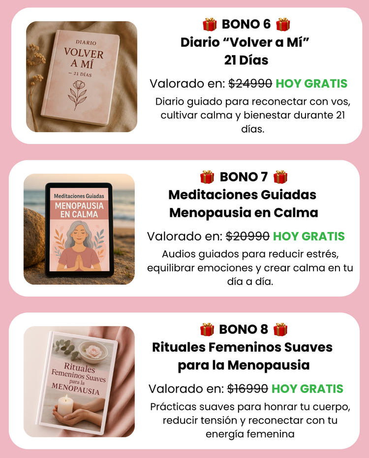 Vas a recibir el ebook Menopausia en Calma en formato digital PDF, más todos los bonos exclusivos incluidos en esta oferta especial (recetarios, plan de 21 días, plantillas, guías y recursos de apoyo).