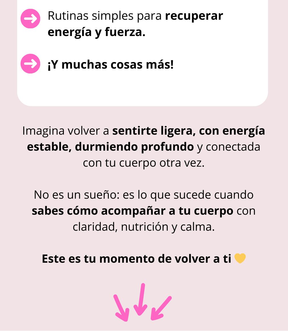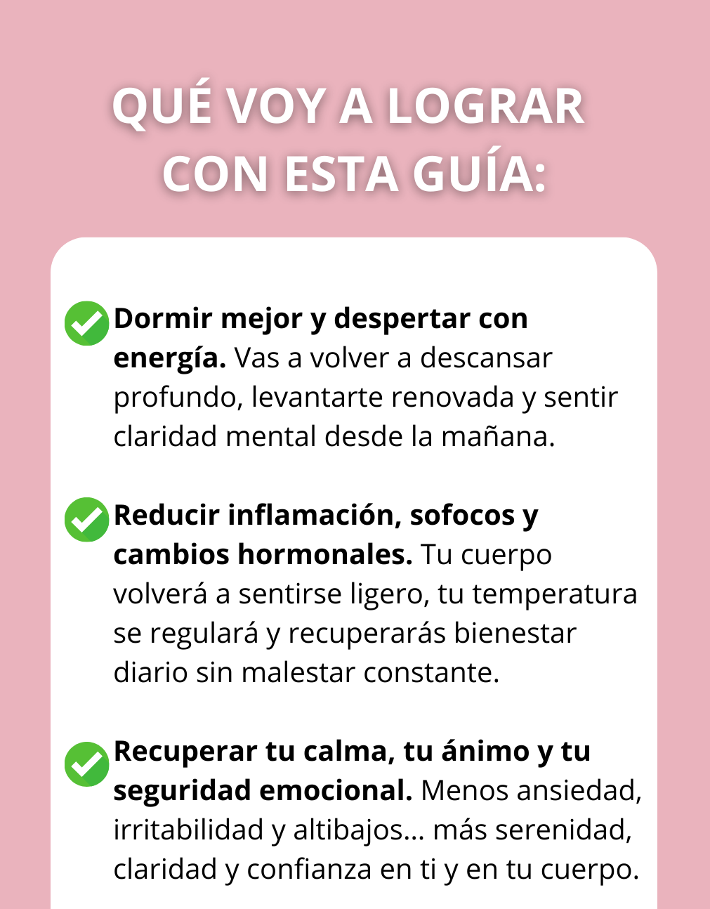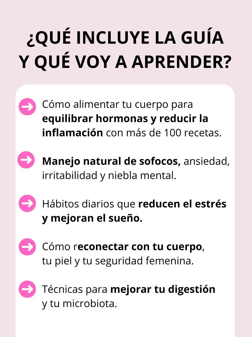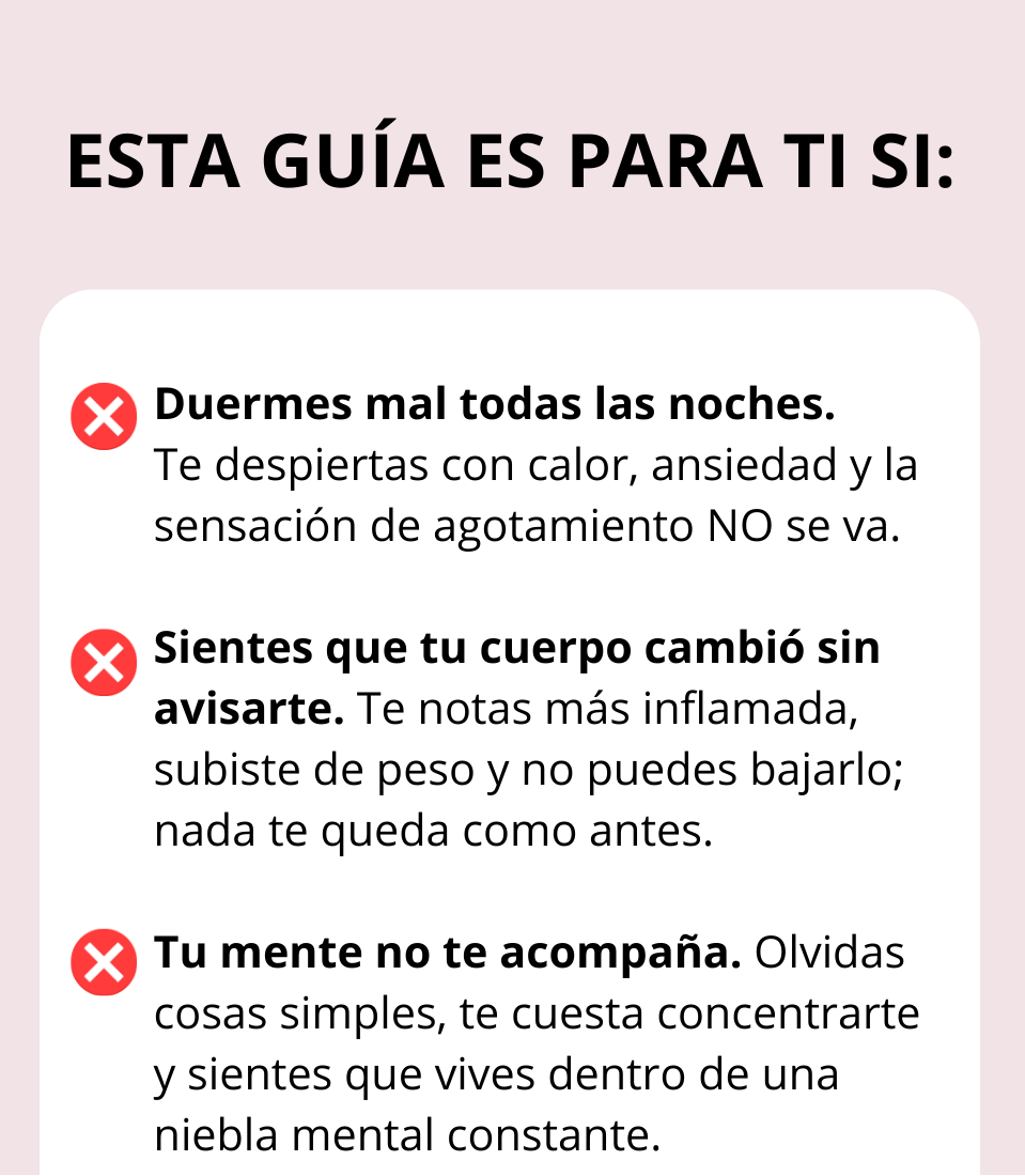 No. Esta guía está diseñada para acompañarte con alimentación, hábitos y bienestar emocional basados en evidencia, pero no reemplaza el acompañamiento médico o profesional individual cuando sea necesario.